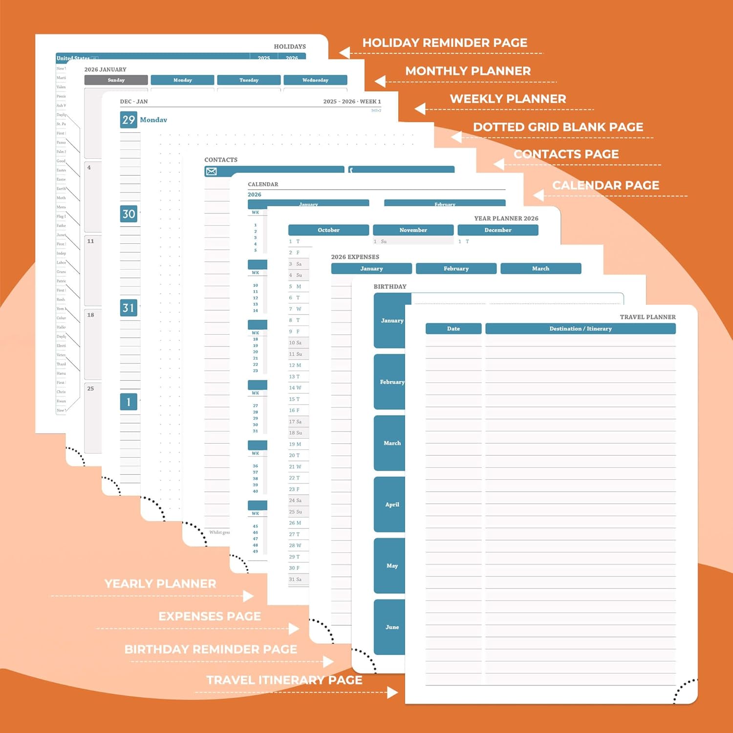 - Universal Design Planner: Suitable for a variety of people and scenarios. Professionals manage project progress, meeting arrangements and goals; student planner 2026 courses, exams and extracurricular activities; home users arrange travel, activitie