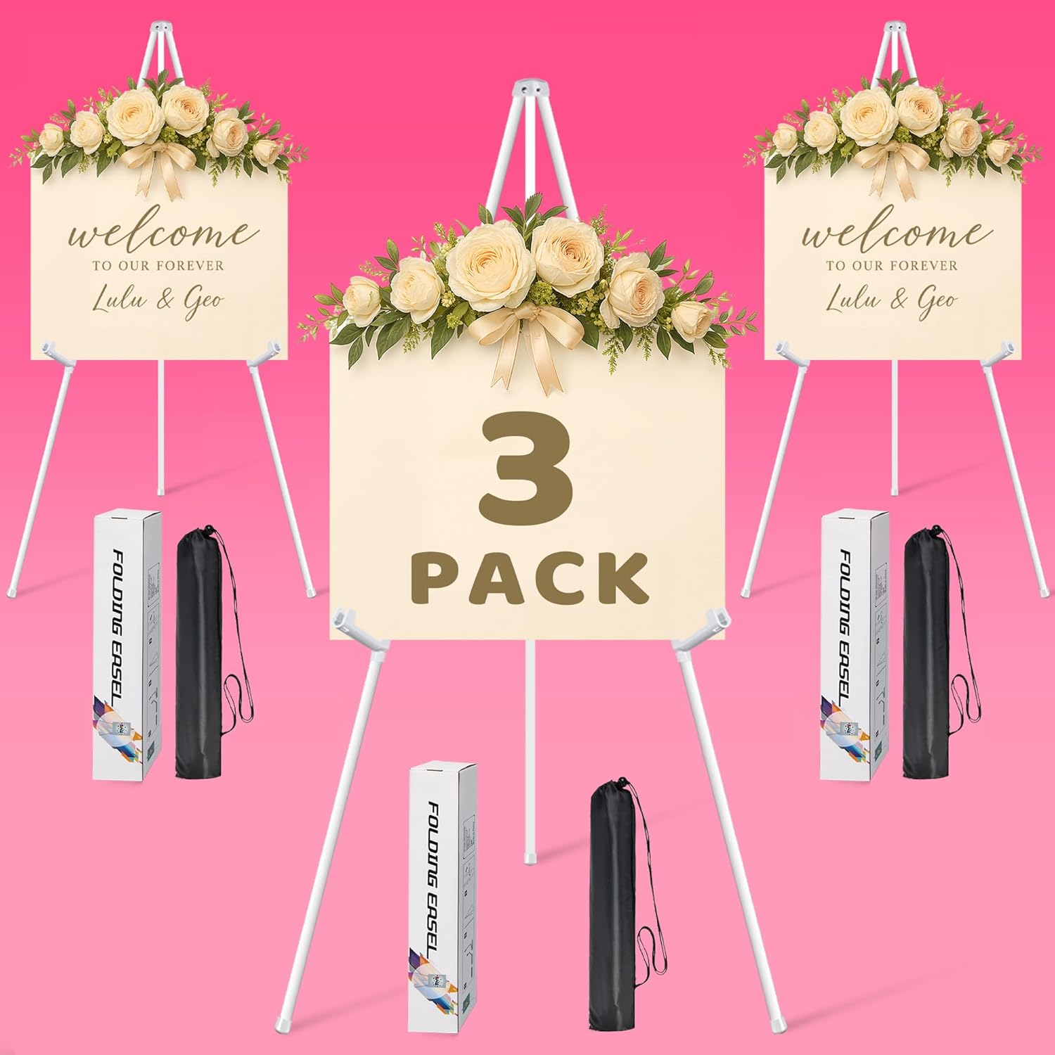 3 Pack White Easel Stand for Sign & Poster - 63" Adjustable Metal Easels for Wedding Welcome Sign, Painting, Canvas, Art Display - Portable Folding Tripod with Carry Bag, Holds 5 Lbs