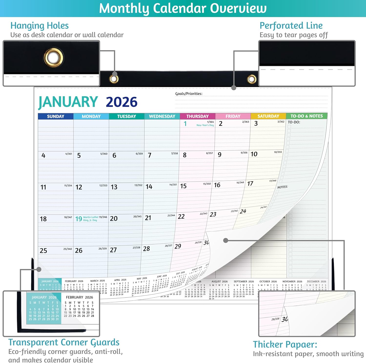 • 🌈 UNIQUE FEATURES – The 2 eco-friendly clear corner protectors are great for preventing rolled pages while keeping the aesthetics and making the date visible. Plus, this calendar 2026 wall has a thick cardboard back that gives good support and protection.