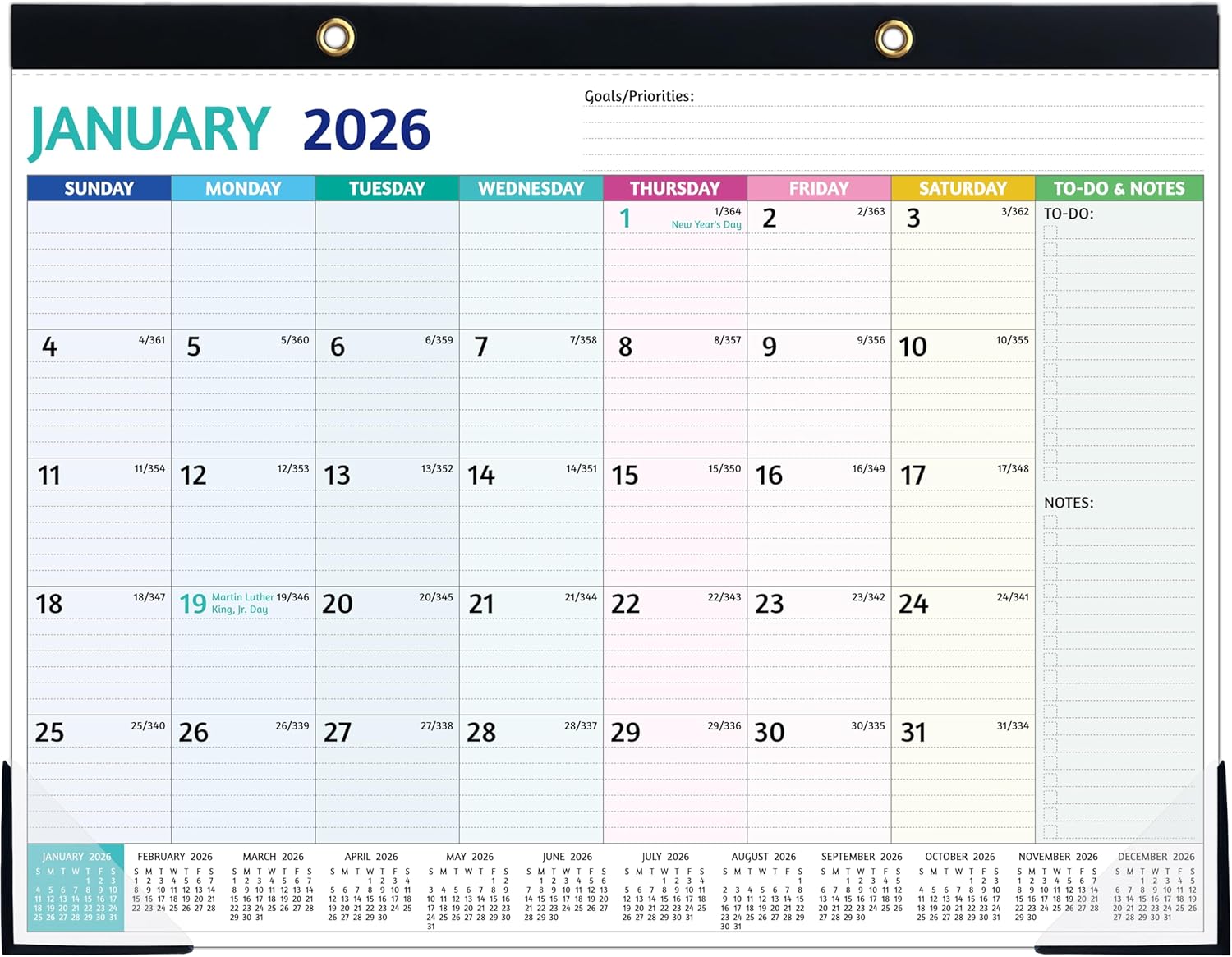 • 🌈 BEAUTIFUL COLOR DESIGN – 7 different color block design for 12 monthly calendar pages make this large 2026 wall/desk calendar a great decoration for your home, office, or classroom. A good reminder for 2026 to make you more efficient, effective and productive!