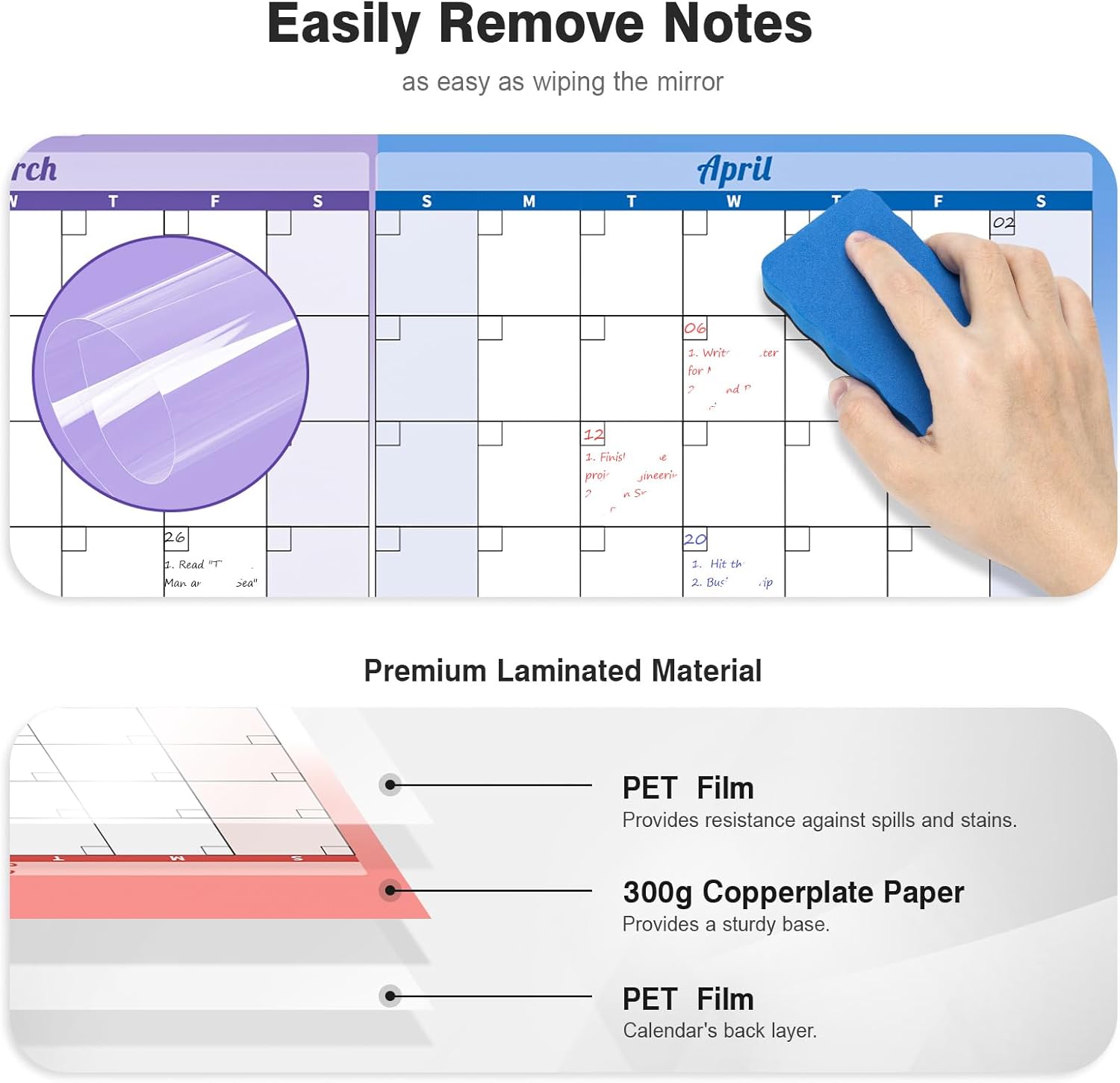 - ⨠Dry Erase Wall Calendar : is made of PET Film and 300 grams Copperplate Paper, providing a durable surface that resists scratches and smudges, while the sturdy Copperplate Paper backing keeps it in place without curling.