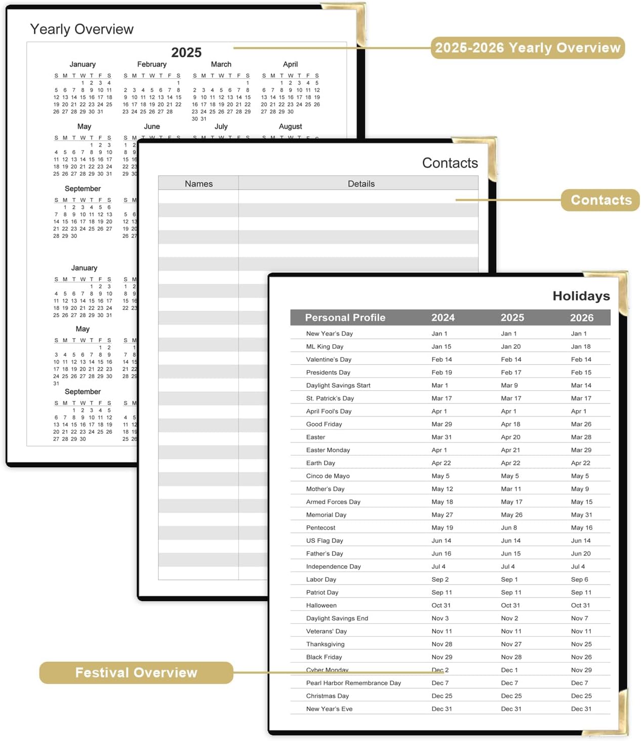 • 224 SHEETS / 448 PAGES - This undated planner measures 8.5 x 11 inches, a comfortable size for daily use and carrying. The planner notebook includes a Yearly Overview, Personal Information, Contacts, Important Dates, Monthly Pages, Daily Pages, Notes Pages, and a festival overview page covering 2025-2027. It comprehensively contains everything needed for daily use.