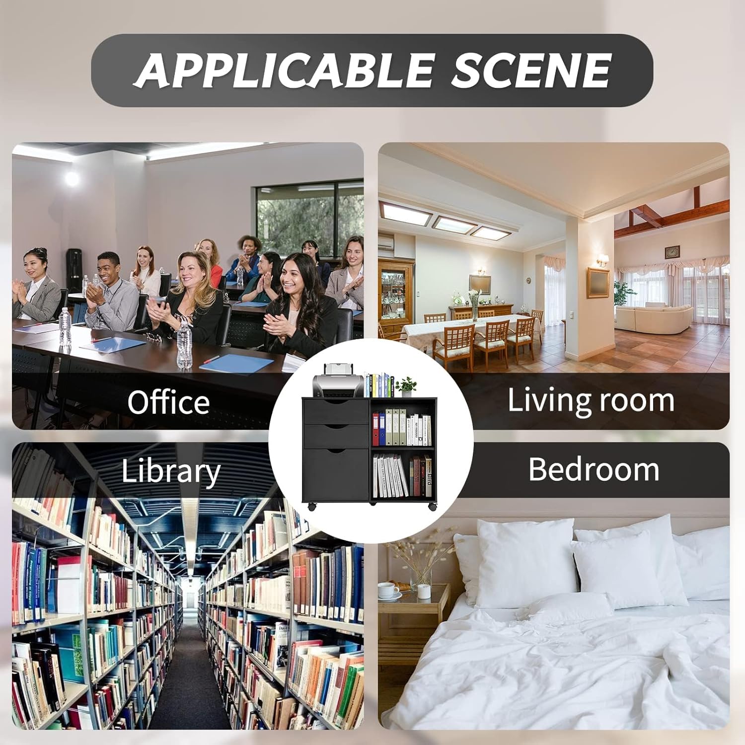 QDSSDECO 3-Drawer with Shelf Wood File Cabinet Mobile Lateral Filing Cabinet, with Rolling Wheel Printer Stand and Open Adjustable Storage Shelves, for Home Office, Black
