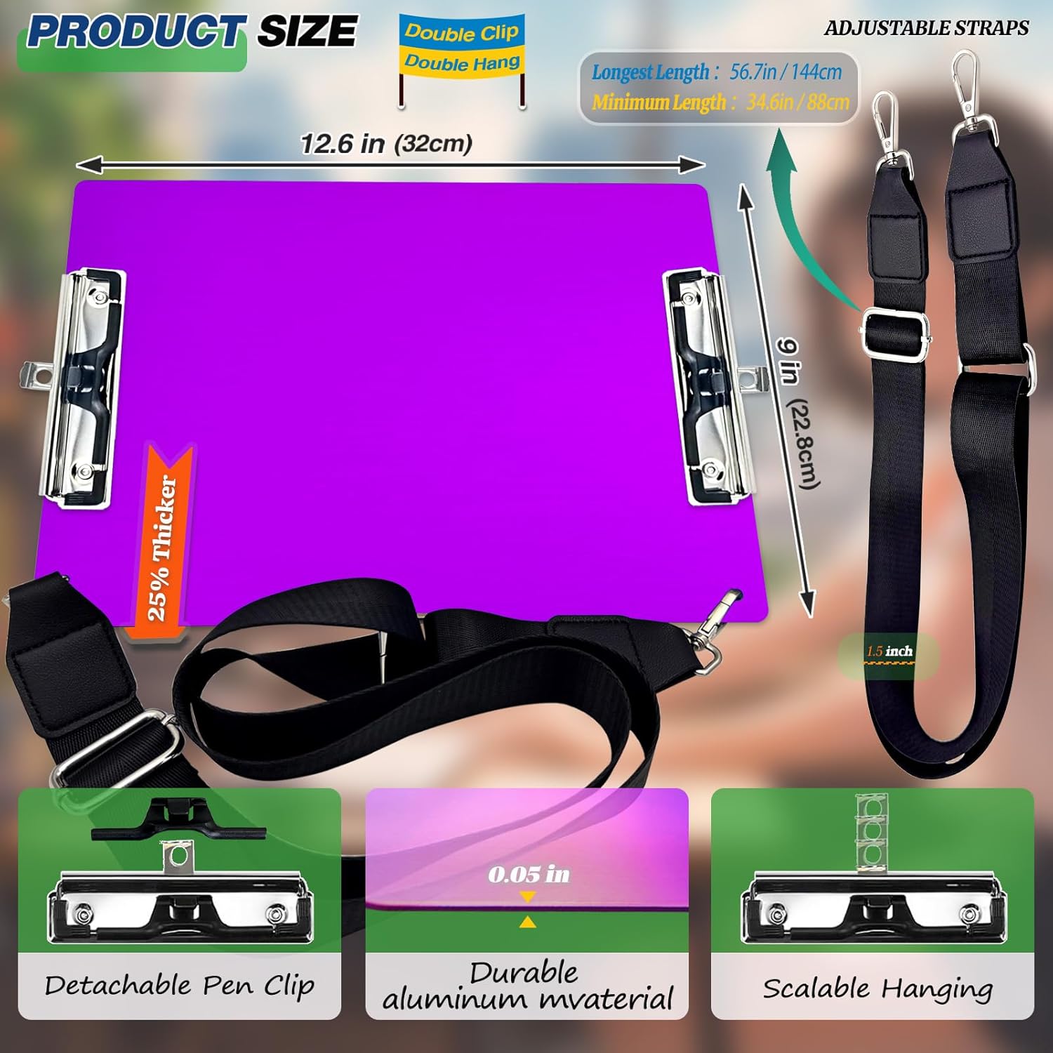 - 【Portable A4 Size】: Size: 9 × 12.6 Inch metal clipboard, Perfect for A4, letter size (8.5 in × 11 in) or downsize paper sheets documents. Shoulder strap adjusted maximum length 57 inches, suitable for a wider range of body types and usage scenarios.