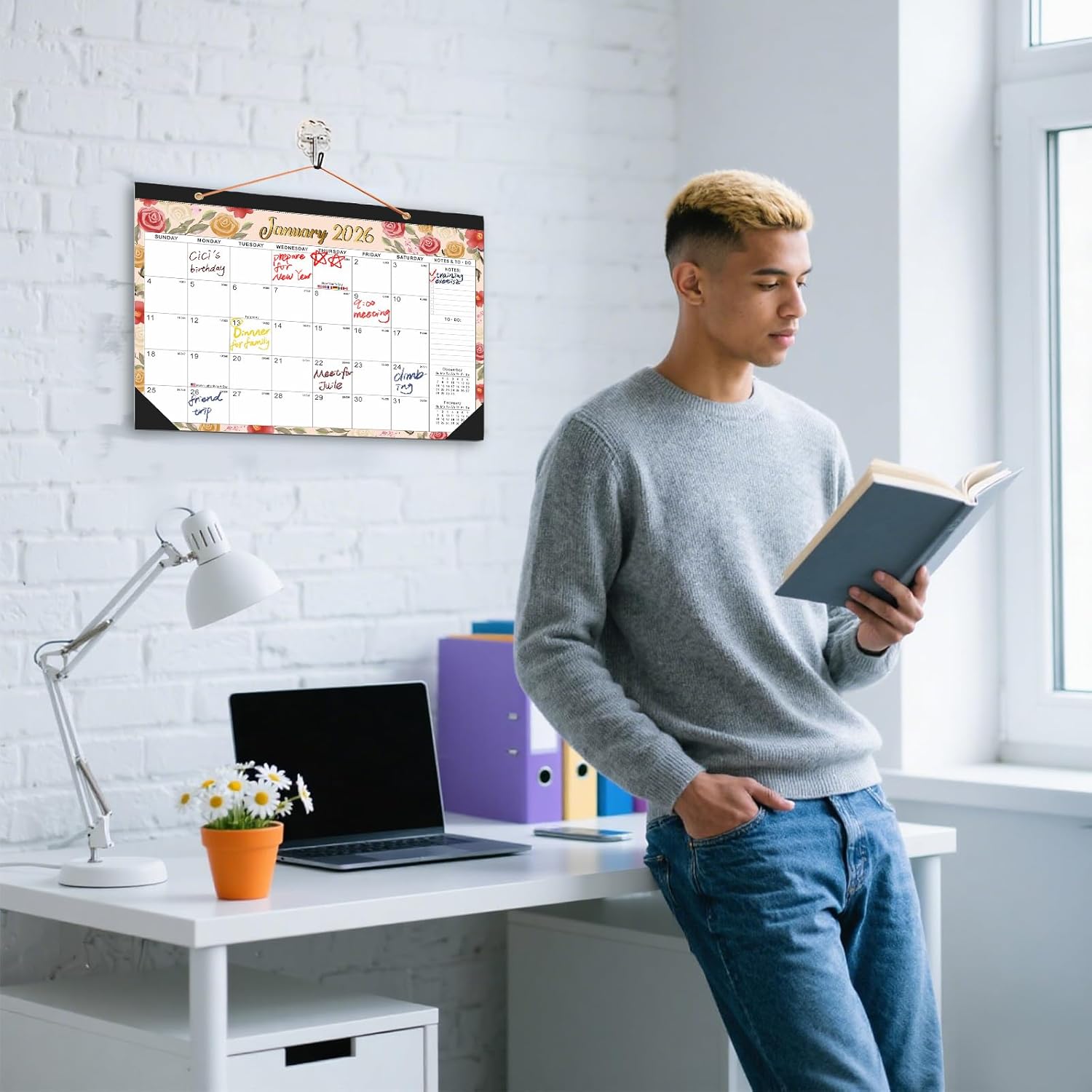 - 【Elegant Watercolor Floral Design & Dual Functionality】 Featuring a soft watercolor floral pattern, this desktop calendar adds aesthetic appeal to any workspace. With a durable built-in hanging rope, it easily transitions from a desk calendar large to a wall-mounted display, ideal for homes, classrooms, or offices.